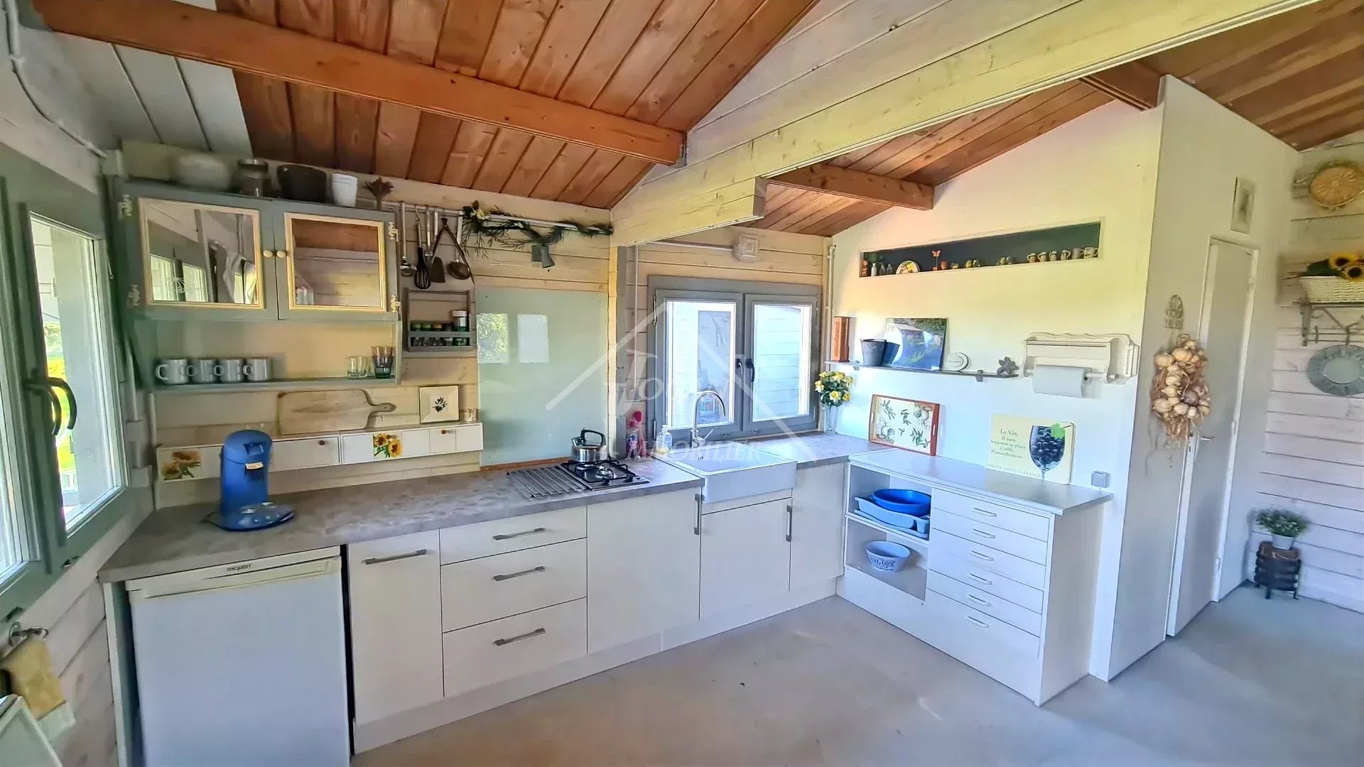 Pour accueillir famille et amis ou profiter du soleil levant, une dépendance avec cuisine d’été permet de savourer les belles soirées en extérieur dans une ambiance conviviale.